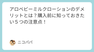 本ページにはプロモーションが含まれています。ニコパパ今日もお仕事・育児に奮闘されたパパの皆さん!1日お疲れ様でした!さて今回は、アロベビーミルクローションを使う上でデメリットはないのか気になるパパさんのこんなお悩みです!アロベビーミルクロー...